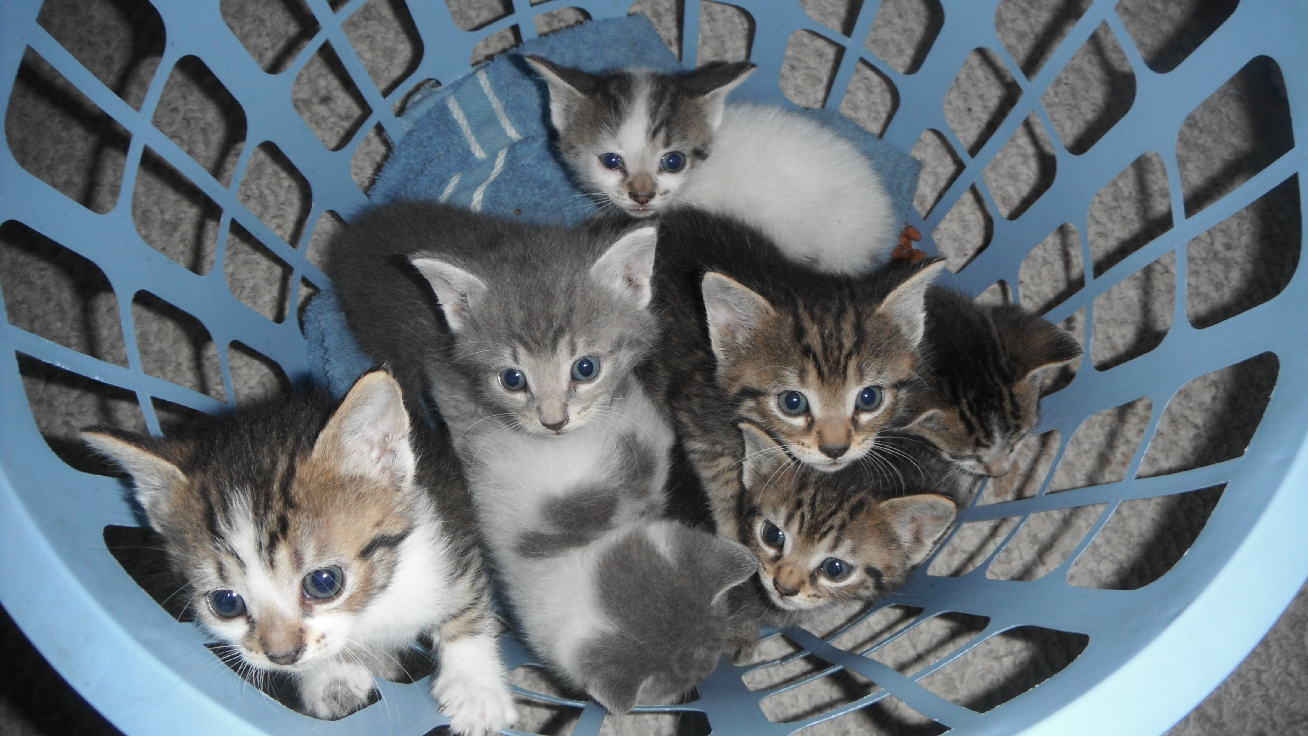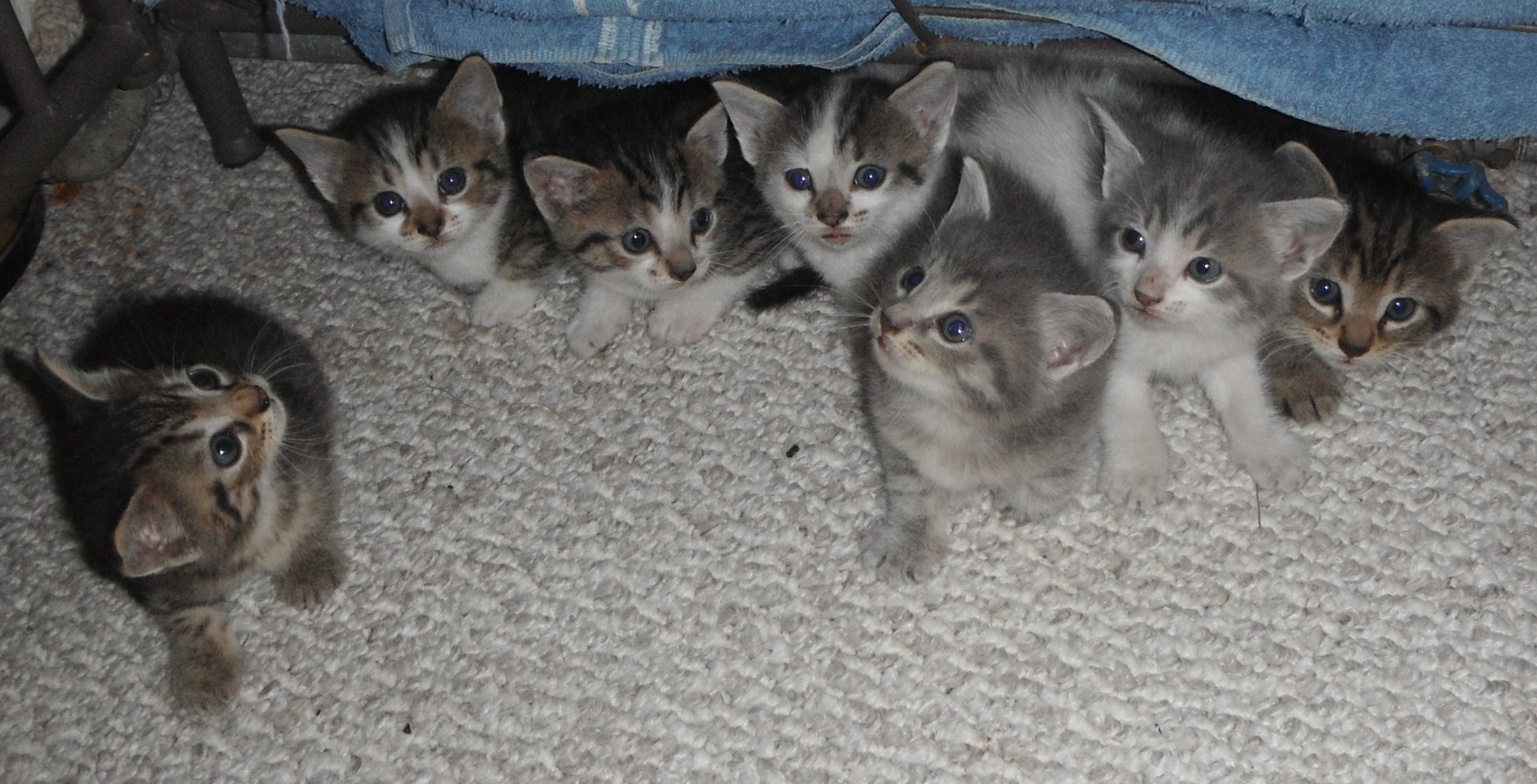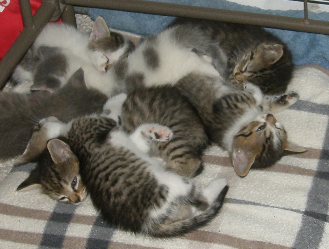 They are using the litter box pretty good–there have only been a few accidents. They are all eating soft cat food and the smaller ones are getting that ‘catsip’ milk too. Their eyes are still blue and they are grooming themselves.