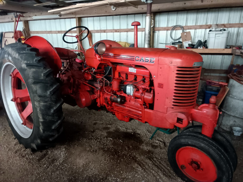Then out of the driving rain two glowing orbs appeared accompanied by a chugging sound. Arriving on the scene was a 1948 Case SC with me at the wheel. I had seen the emergency flashers through the trees behind the house, and went out to investigate. Observing the dilemma I thought I might be able to help. I fired up the old Case, and we chugged out to the scene. The firemen stepped back as I attached a heavy tow strap to the heavy trunk.