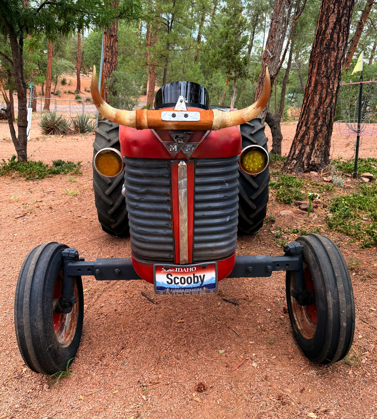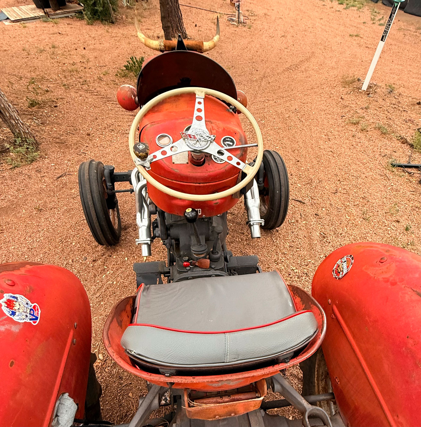 I thought that adding a few upgrades such as a new Steiner seat, and a tuneup kit made her purr. I grew up in Idaho and thought children would enjoy my longhorns and Jakalope funny farm logo. The Chevy exhaust headers usually get grins and giggles from the youngsters. I also added a 1958 Corvette steering wheel.