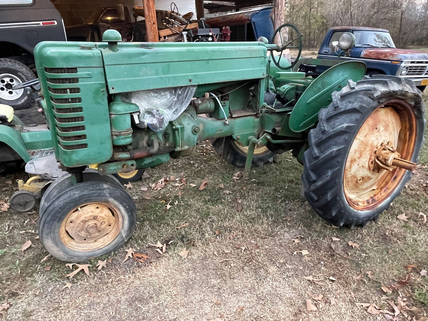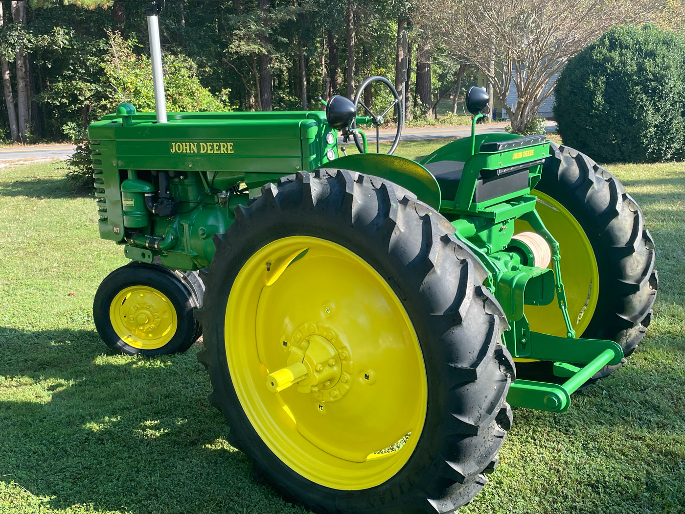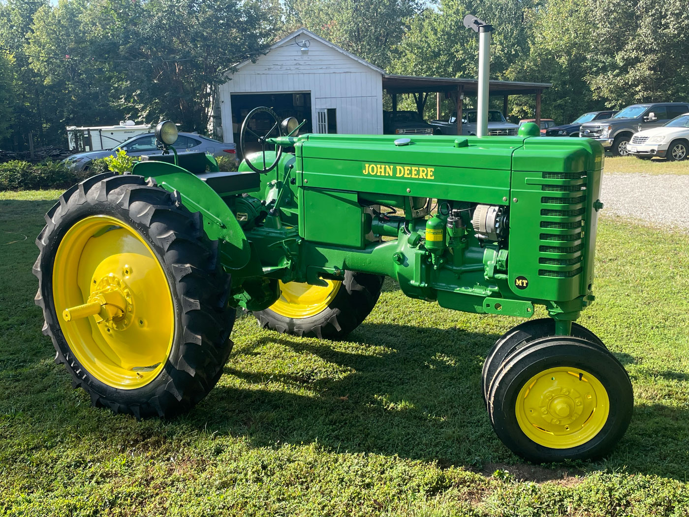 This tractor is a 1949 John Deere MT, my grandfather purchased new, and my father used as a teenager and young adult to help work the family farm. My father used to tell the story about how this was their first tractor, and his father sold their pair of mules to purchase it. My dad said he did not miss plowing fields behind a pair of mules.