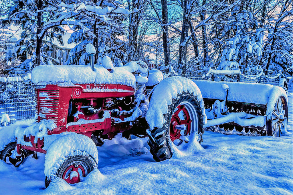The 1948 Farmall “M” was purchased in Sac City, Iowa and transported to Cedar City, Utah, where it was restored. The Oliver superior seed drill was found in Monroe, Utah frozen to the ground in the owners backyard.