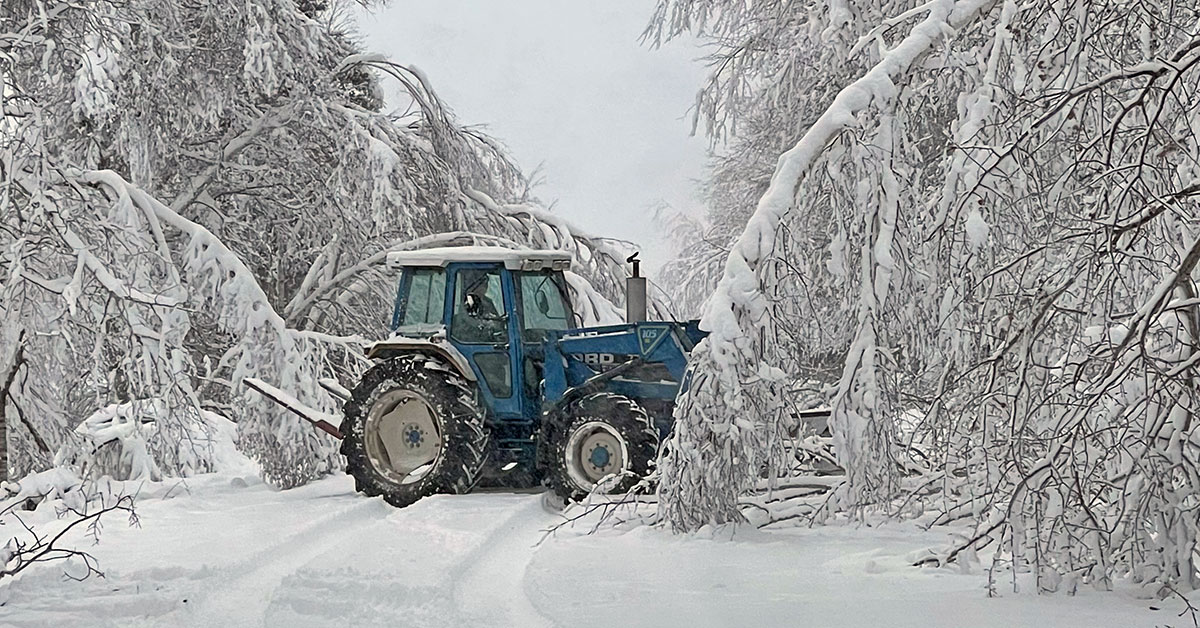 Ford 7710 Diesel. We had a terrible storm Dec 15th of 2022, and the trees had heavy loads of ice and snow on them and were blocking our road. We had no electricity for a few days. Terry used the tractor and chain saw to clear a path down our road to the main road so some traffic could at least get through. It took a couple of weeks for the area to finally get all the power back on. Quite an adventure. The cows had to eat snow for a couple of days as we had no way to get water to them.