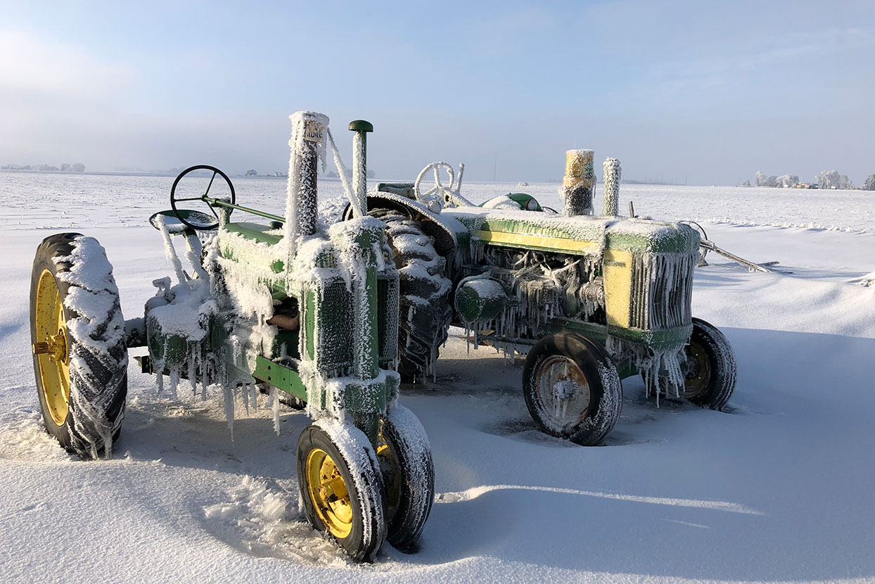 On a frosty, January afternoon, we ventured outside to take photos of the snow for our son who lives in Southern Illinois. The tractor on the left is a 1938 Model A owned by our grandson Brentan. The second tractor is a 1959 John Deere Model 820 belonging to our grandson Trent. The beautiful sunshine on the “frozen tundra” really enhanced the scene and made for a nice shot.