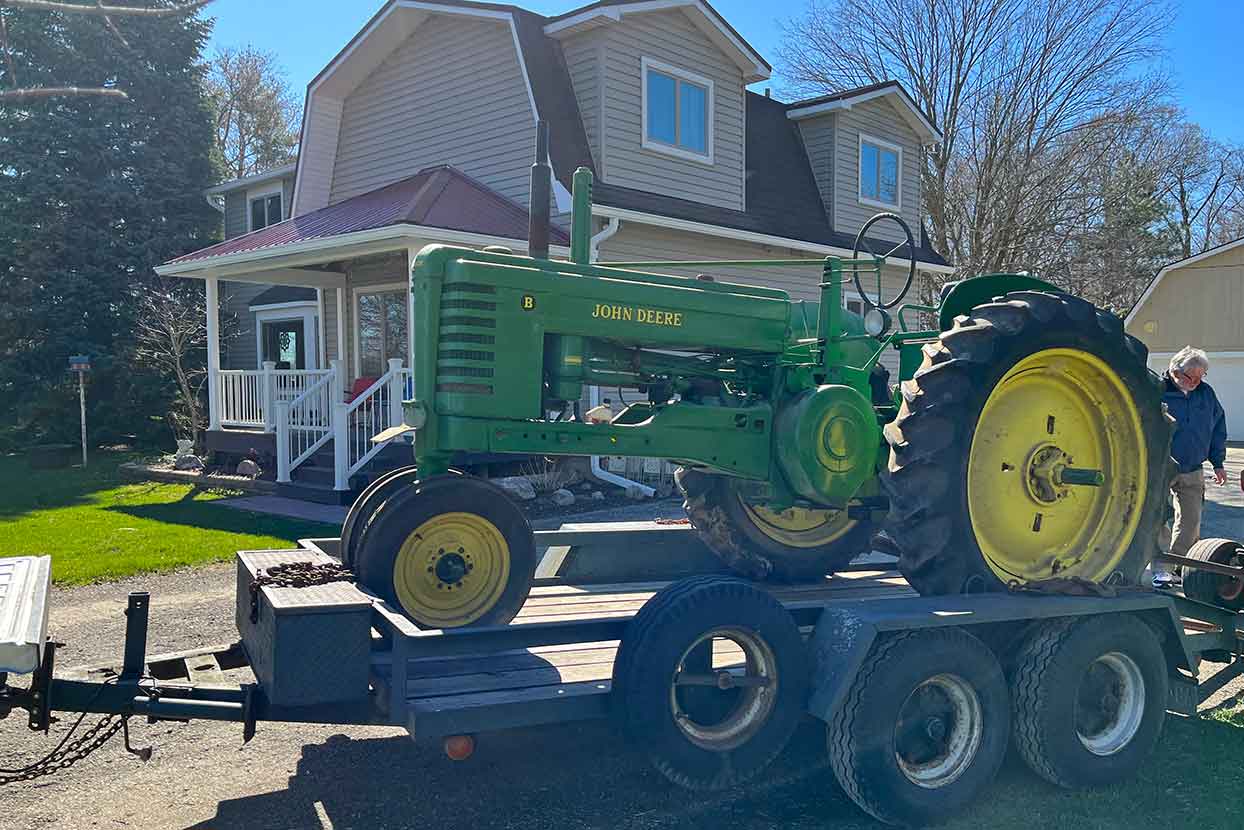 April 6th, 2024 was the day I brought home MY 1950 John Deere B. We rolled it off the trailer, into the driveway. First thing we did was put a new battery and fuel into it, along with cleaning out the mouse house in the grills. It rolled over. We tried and tried and nothing. After a bit of trying, this dark, black liquid started pouring out of where the muffler connects to the exhaust pipe, and we could not figure out what it was. It didn’t smell like anything other than rusty water. We ended up taking the spark plugs out, and rolled it without them. Immediately, a stream of fuel shot out both sides, the left side right onto my grandfather, who had a cigarette in his mouth. Nobody was hurt, but he put a rag over the sparkplug hole. After a little thinking, we realized the liquid was fuel. Dark, carbon filled fuel was pouring out of the exhaust. We removed the carb and cleaned it thoroughly, and put it back on. The tractor fired off. I was sitting there in complete shock, I hadn’t heard a B run before. Only my grandpa’s John Deere M. It was such an amazing event for me, within 45 minutes of rolling off the trailer, I had it running. I took it for a little ride around the property. The tractor ran horribly, but it ran.